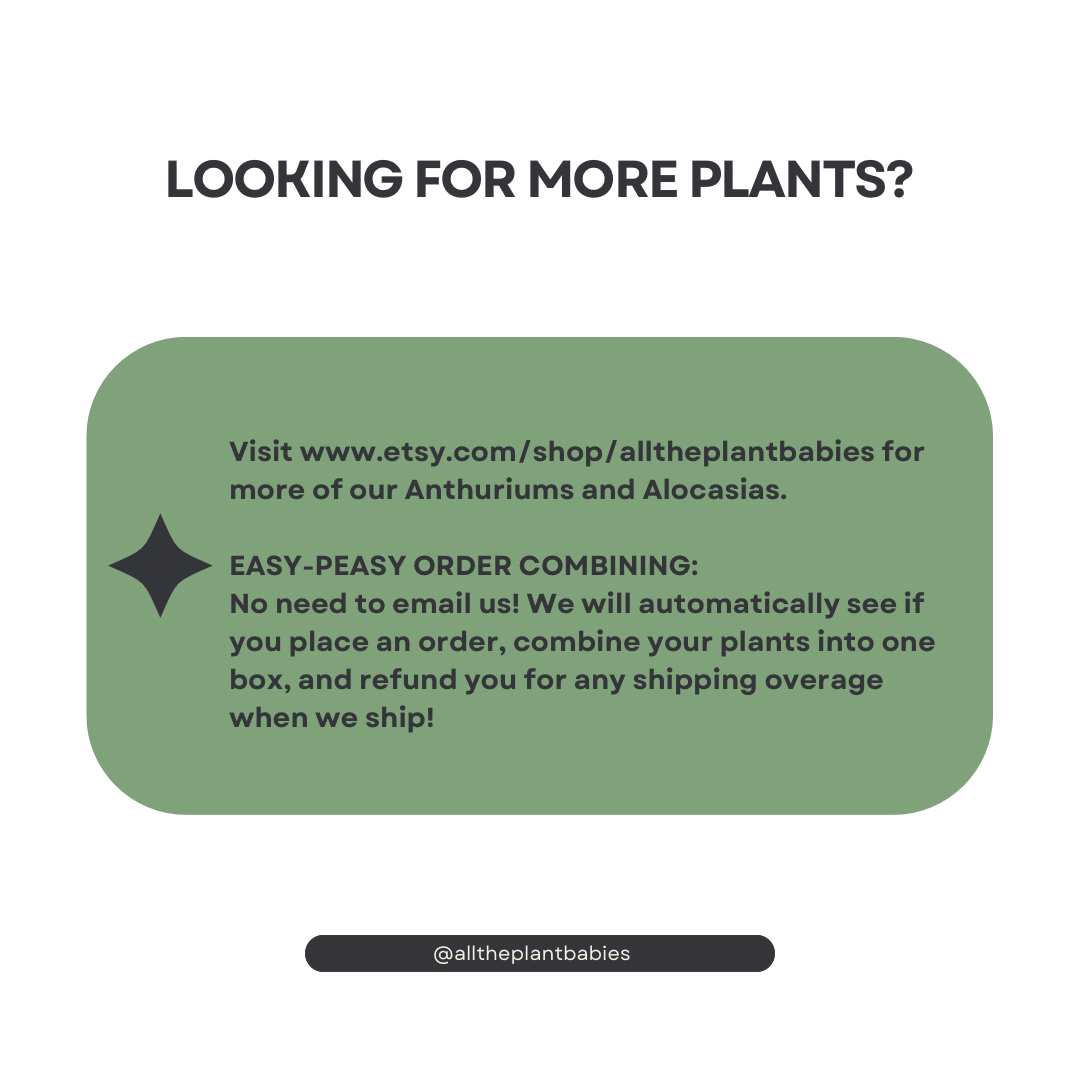 Shop All Unique plants, endemic to the rain forest, grown in Chicago, IL. Categories: All Book & Accessories Anthuriums Alocasias Hoyas Shipping Add-Ons Monsteras Philodendrons Shop All Book & Accessories Anthuriums Alocasias Hoyas Shipping Add-Ons Monsteras Philodendrons Large Sticker: "Red Crystals Are A Girl's Best Friend" / 5" Waterproof Shiny Glitter Vinyl / Hydroflask Laptop Sticker $4.00 Add To Cart Added! Alocasia Black Velvet Pink Corm. Grow your own Alocasia from corm/ bulb! $45.00 Add To Cart Added! Alocasia Micholitziana 'Frydek' Aurea Variegated SPROUTED CORM! Grow your own Alocasia from corms/ bulb! $45.00 Add To Cart Added! Anthurium Raspberry Plum F2 (1x5) - Plant #M1 - Two Plants in one pot! $105.00 Add To Cart Added! Anthurium Raspberry Plum F2 (2x5) - Plant #L1 $105.00 Add To Cart Added! Red Crystal Blush F2 Anthurium (2x1) - Plant "Z5" $90.00 Add To Cart Added! Red Crystal Blush F3 Anthurium (1x2) - PREMIUM Plant C4 - Exact Plant Shown $170.00 Sold Out Sold Out Added! Anthurium Electric Forest -Besseae aff x Dark Forgetii - "G5" Exact Plant Shown $45.00 Add To Cart Added! Red Crystal Blush F2 Anthurium (2x1) - Plant "Z2" $75.00 Add To Cart Added! Red Crystal Blush F2 Anthurium (2x1) - Plant "Z1" $90.00 Add To Cart Added! Alocasia 'Yucatan Princess' Variegated CORM! Grow your own Alocasia from corms/ bulb! $90.00 Add To Cart Added! Anthurium Zara x Michelle From Doc Block, Tezula in 2023; Fully Rooted- Plant "ZM2" $100.00 Sold Out Sold Out Added! Variegated Alocasia ‘Green Unicorn’ Aurea (azlanii x baginda ‘Dragon Scale’)- Plant J1 $175.00 Sold Out Sold Out Added! Anthurium Raspberry Plum F2 Plant #K5 (1x5) $105.00 Add To Cart Added! Anthurium Raspberry Plum F2 Plant #K5 (1x5) $105.00 Add To Cart Added! Anthurium Raspberry Plum F2 Plant #K8 (1x5) $105.00 Add To Cart Added! Anthurium Raspberry Plum F2 Plant #K3 (1x5) $105.00 Add To Cart Added! Alocasia Venom CORM! Grow your own Alocasia from corms/ bulb! $65.00 Add To Cart Added! Autographed Copy - The Ultimate Guide to Houseplant Propagation $26.00 Add To Cart Added! Alocasia Chaii- Rare, Grown from SEED (not corm) $39.00 Add To Cart Added! 25 Iridescent Plant Tags - Pack of 25 $10.00 Add To Cart Added! Sticker: "Grow Through What You Go Through" / Waterproof Matte Vinyl / Hydroflask Laptop Sticker $3.50 Add To Cart Added! Crop Top : "Grow Through What You Go Through" / Houseplant Shirt $24.00 S M L XL 2X Add To Cart Added! Alocasia Corm Propagation Vessel $8.00 Fluval & Perlite Lechuza Pon Add To Cart Added! Heat Pack + Insulation: Cold Weather Shipping Protection and Guarantee when nighttime temps fall below 45 degrees $5.00 Add To Cart Added! Heat Pack ONLY Add-On for when night time temps fall between 45-55F $2.00 Add To Cart Added!