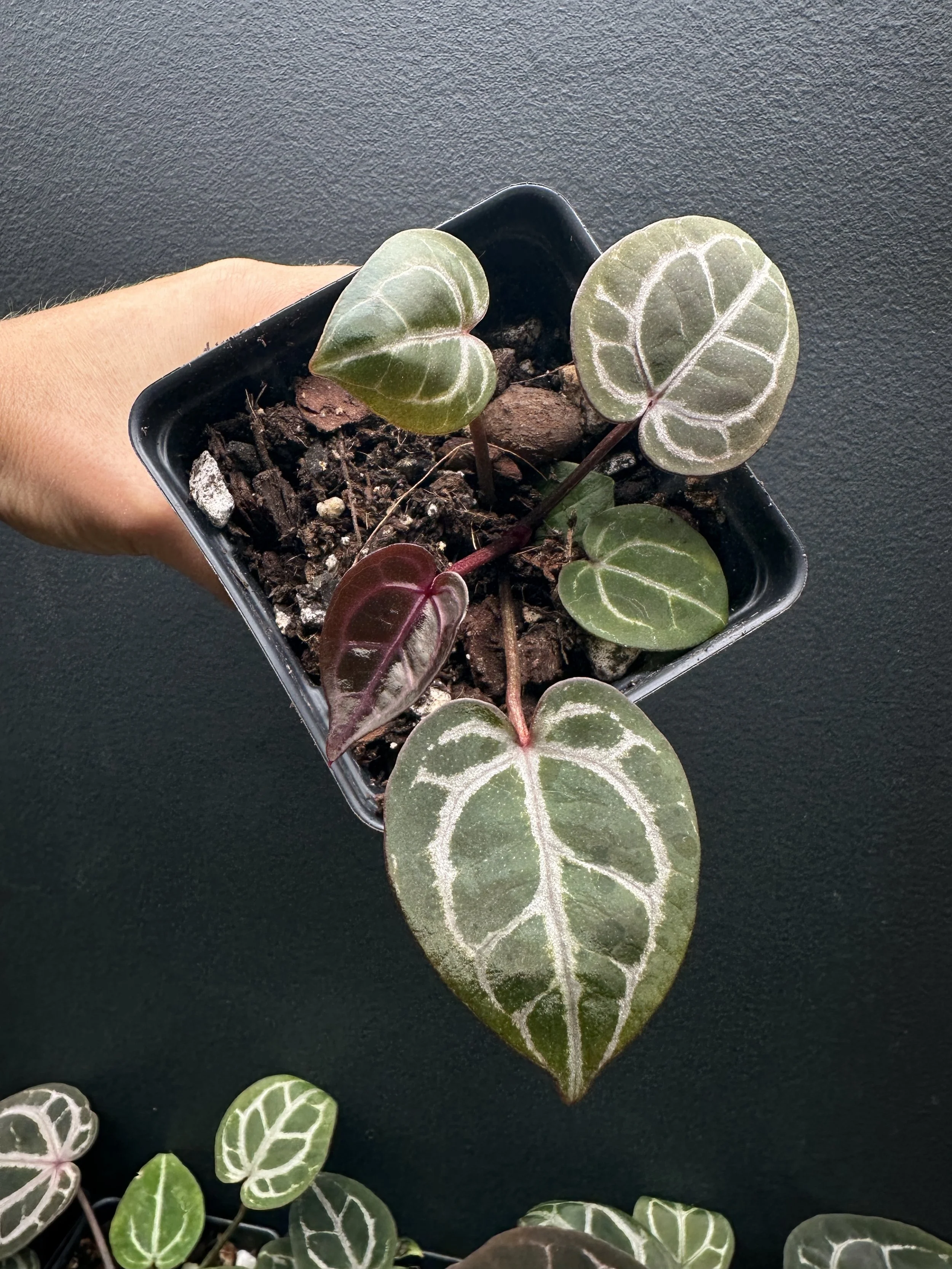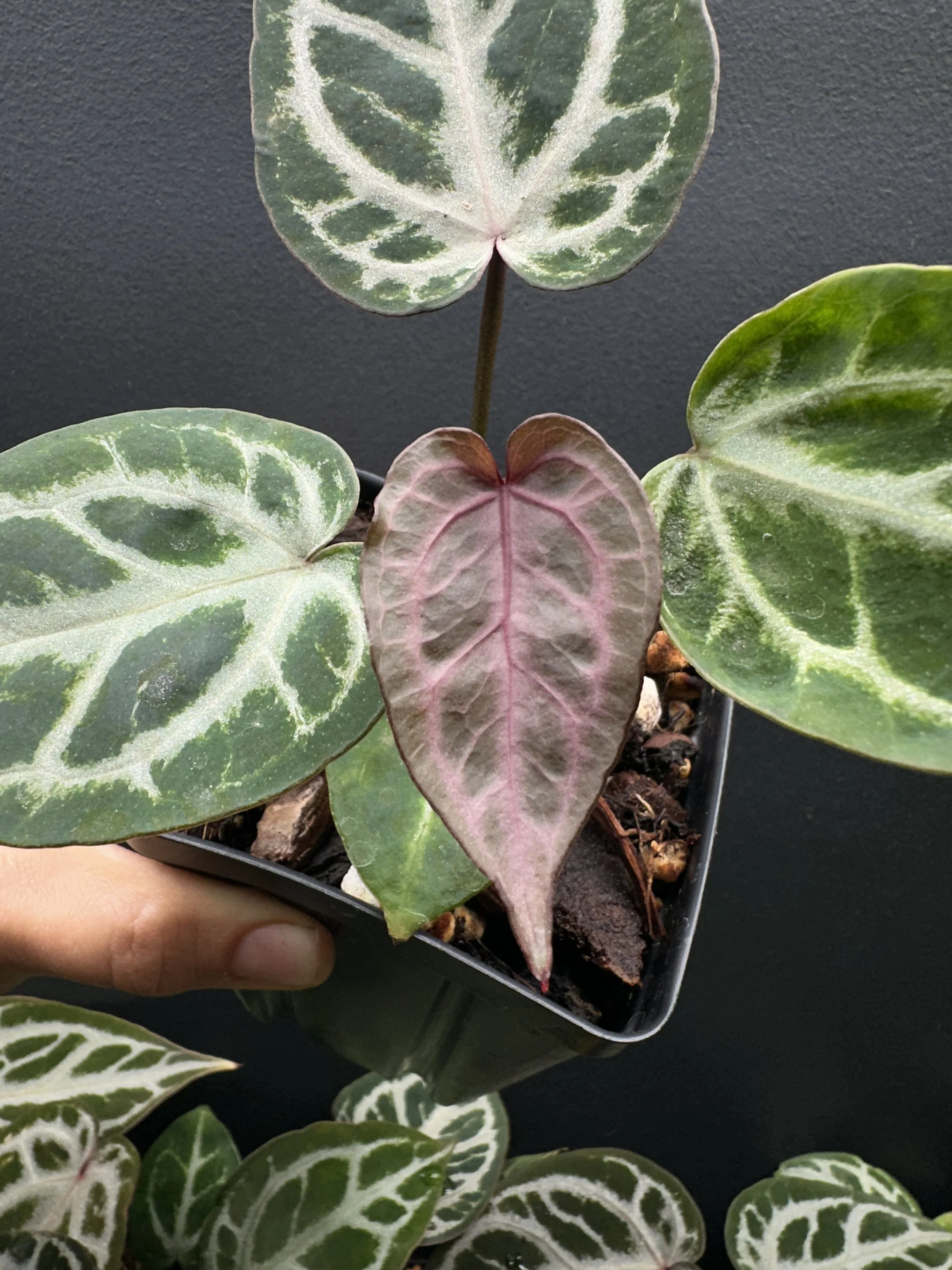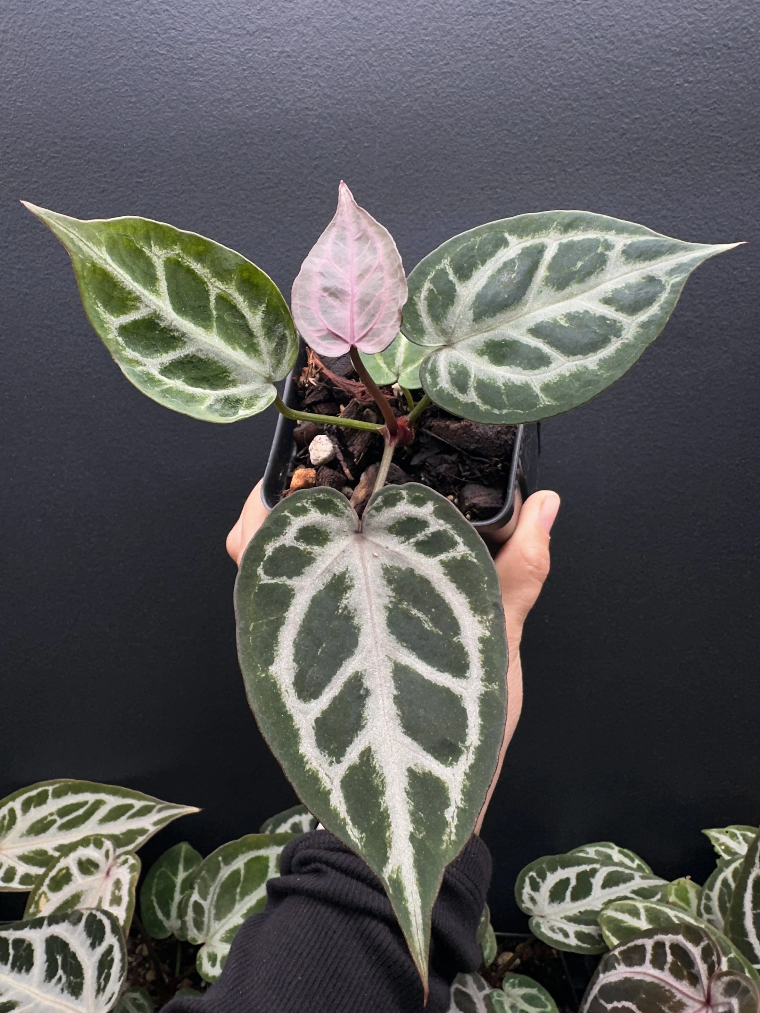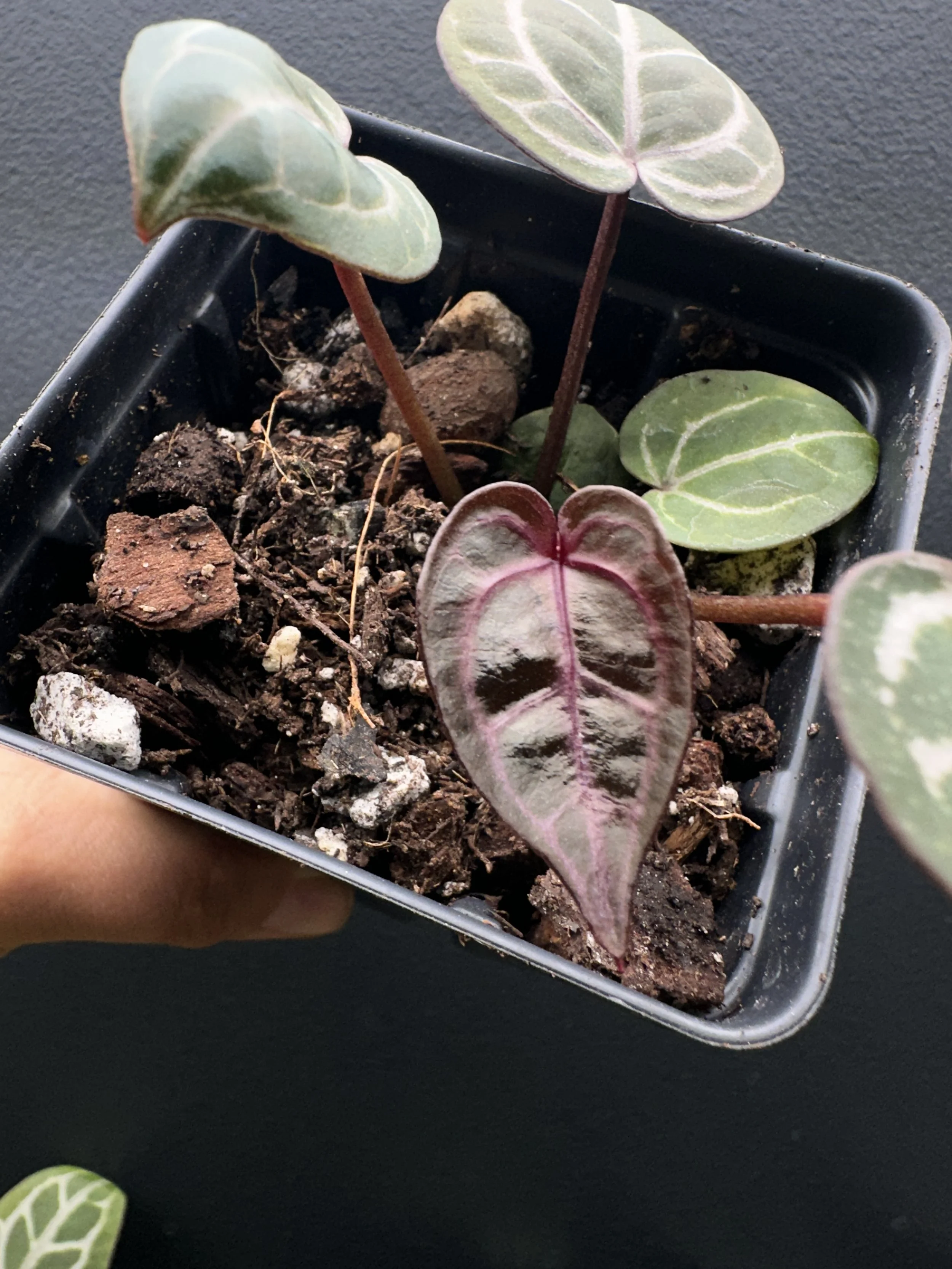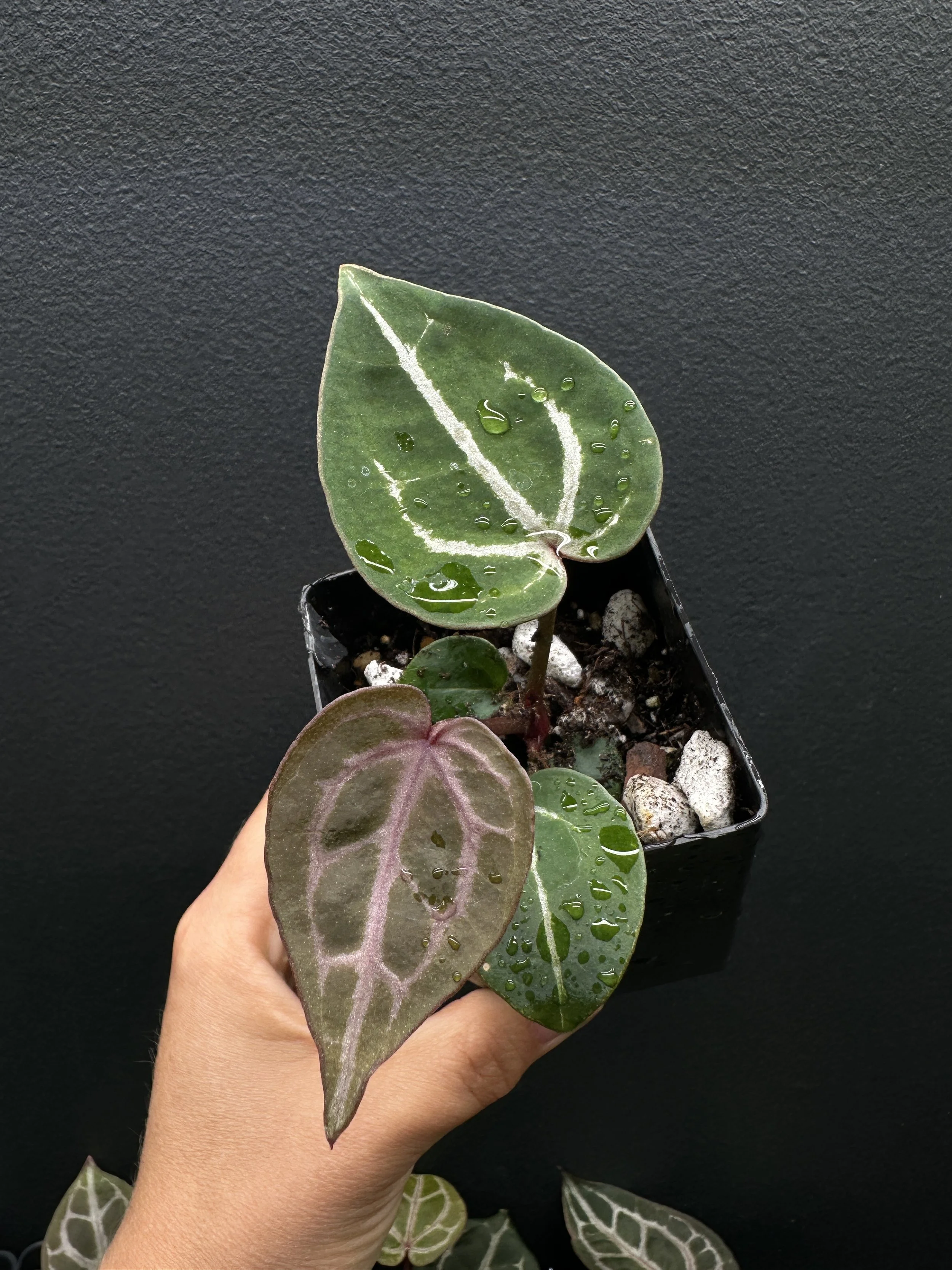 Anthurium Red Crystal Blush F3 generation plant (third breeding generation). You will get the exact plant shown. I price plants based the color of the emergent leaf, amount of silver, and leaf shape. Red and purple vivid emergents, high amounts of silver and round leaf shapes are most desirable. All leaves harden off to green.