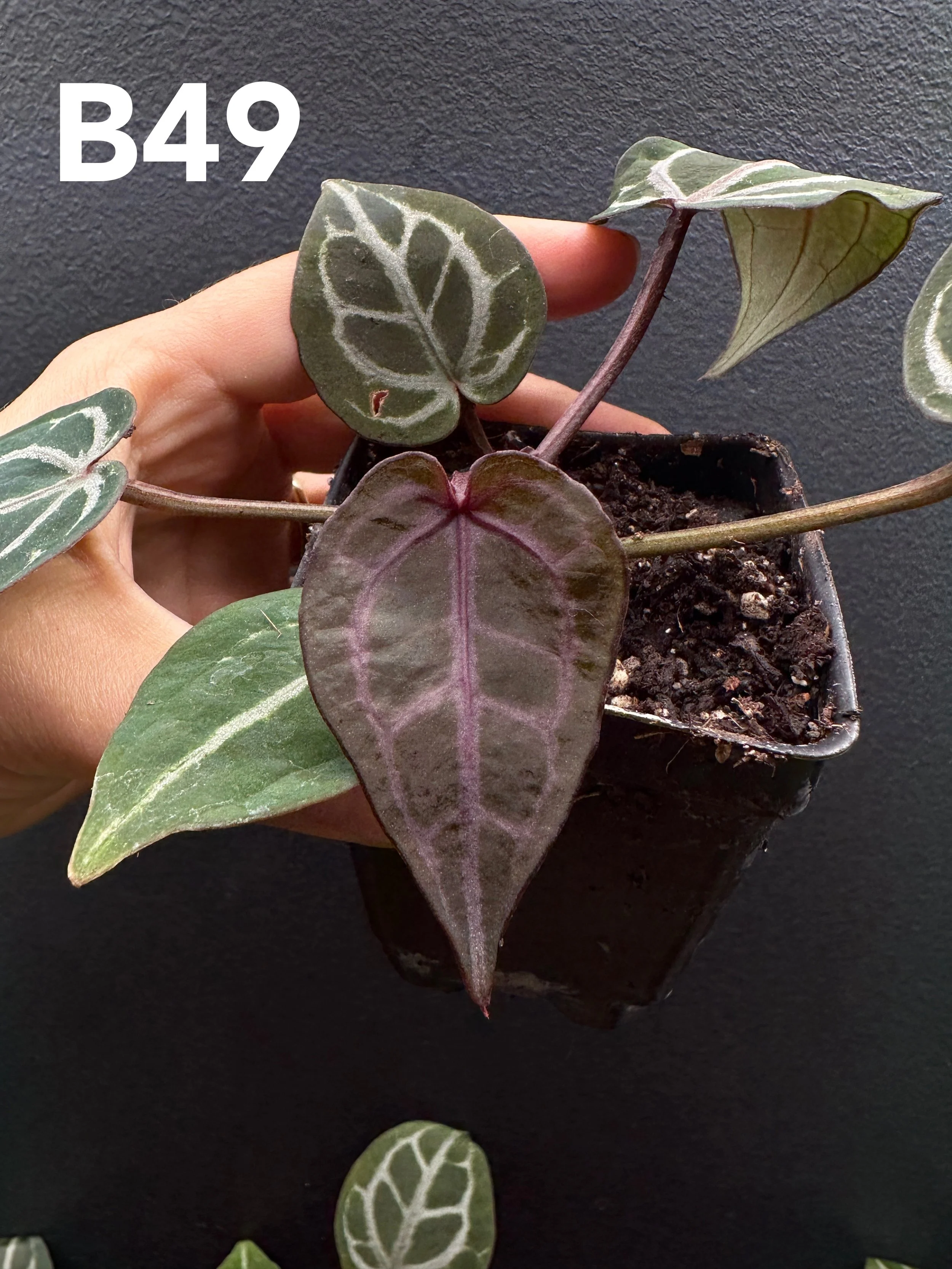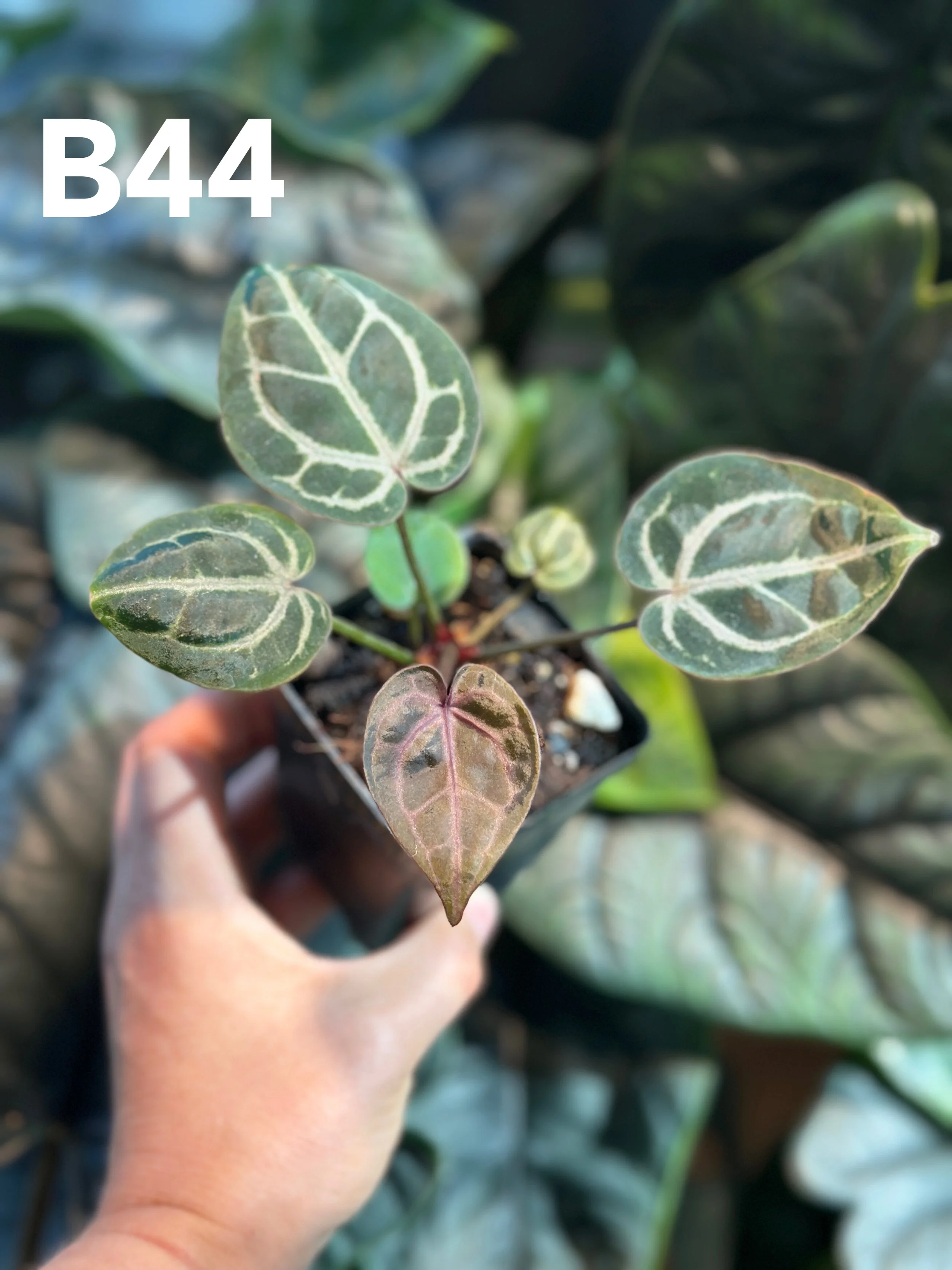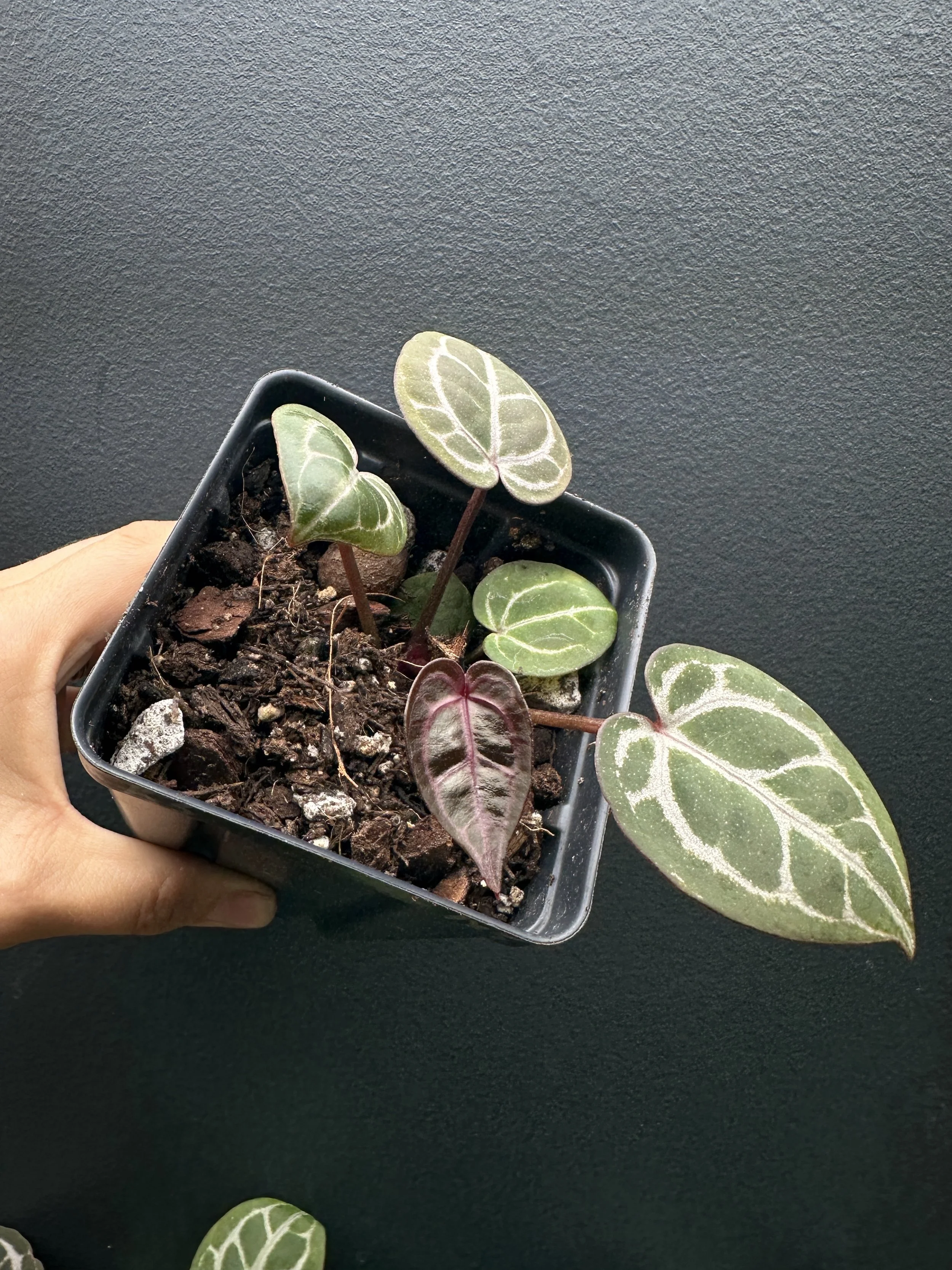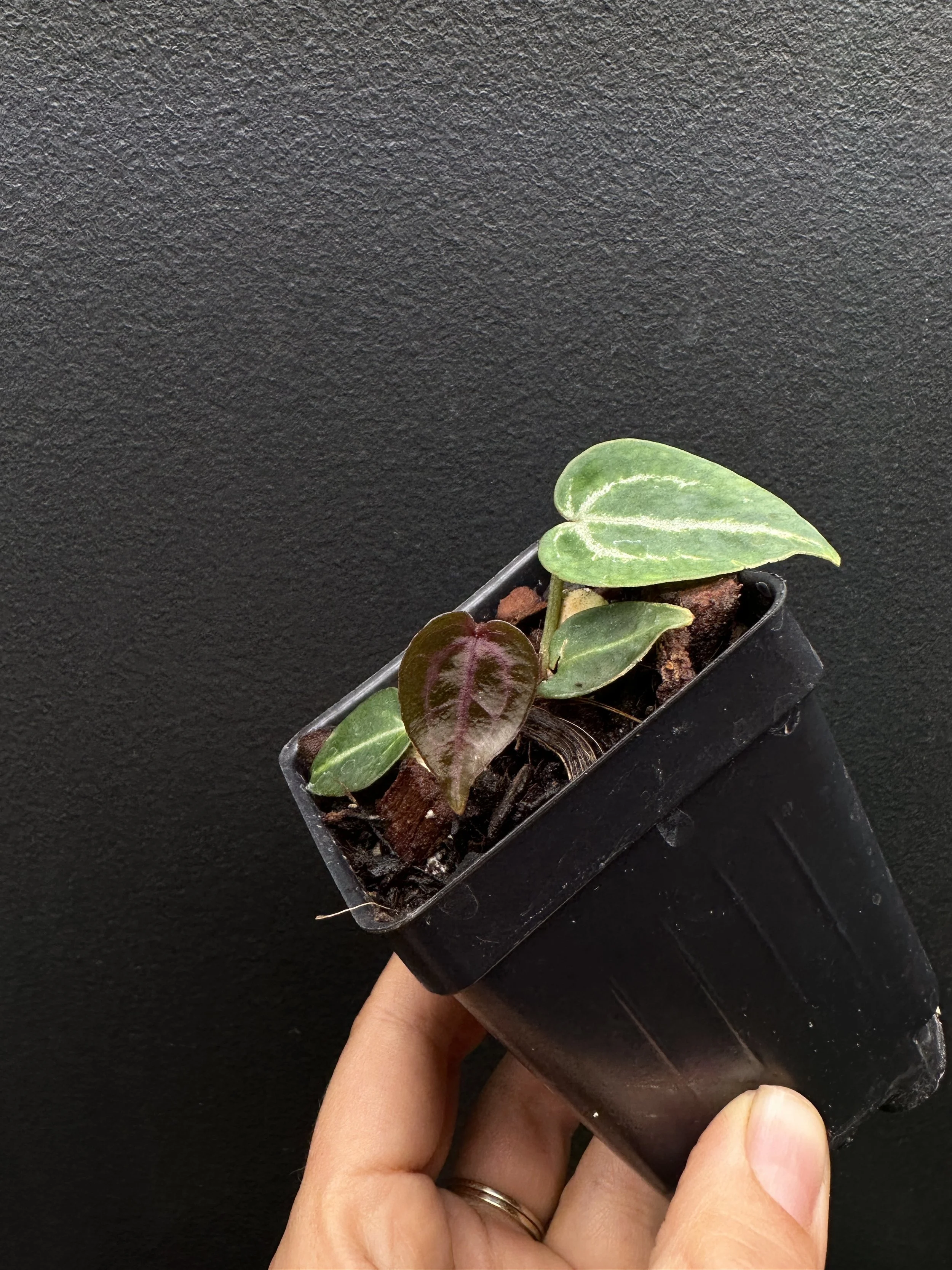 Anthurium Red Crystal Blush F3 generation plant (third breeding generation). You will get the exact plant shown. I price plants based the color of the emergent leaf, amount of silver, and leaf shape. Red and purple vivid emergents, high amounts of silver and round leaf shapes are most desirable. All leaves harden off to green.