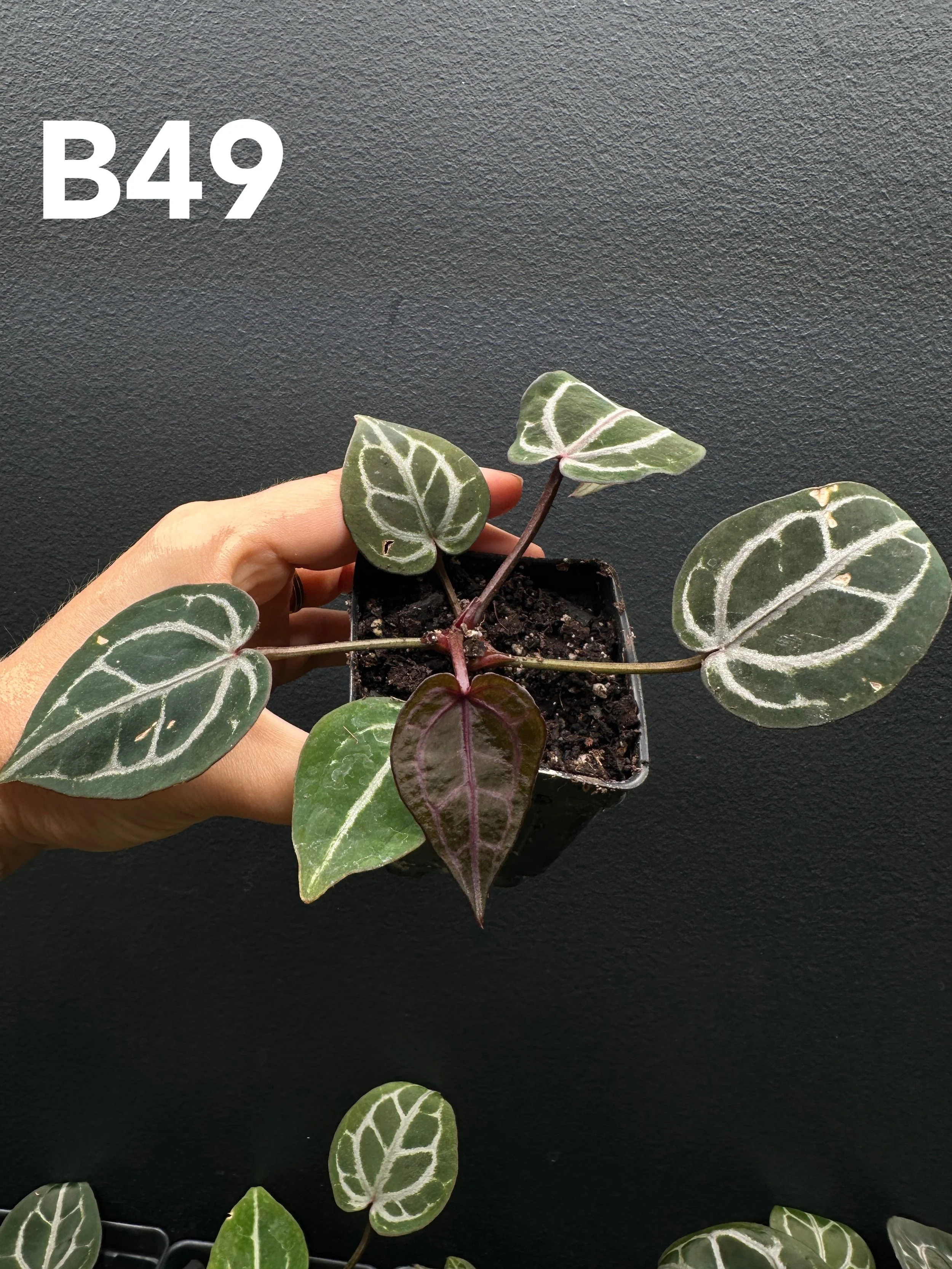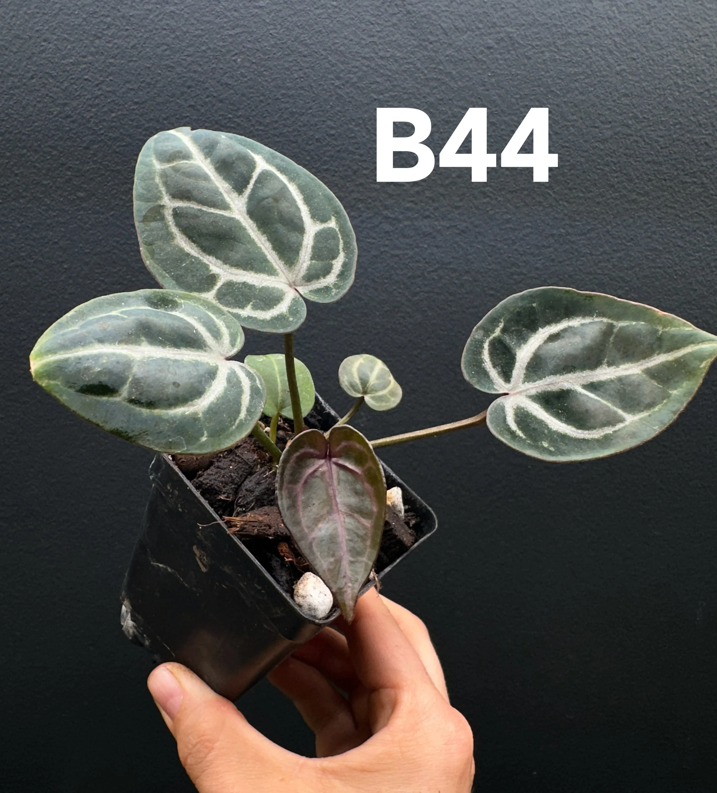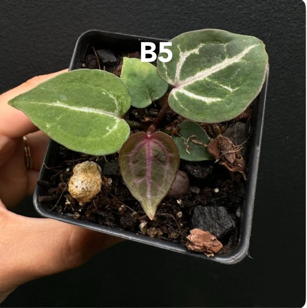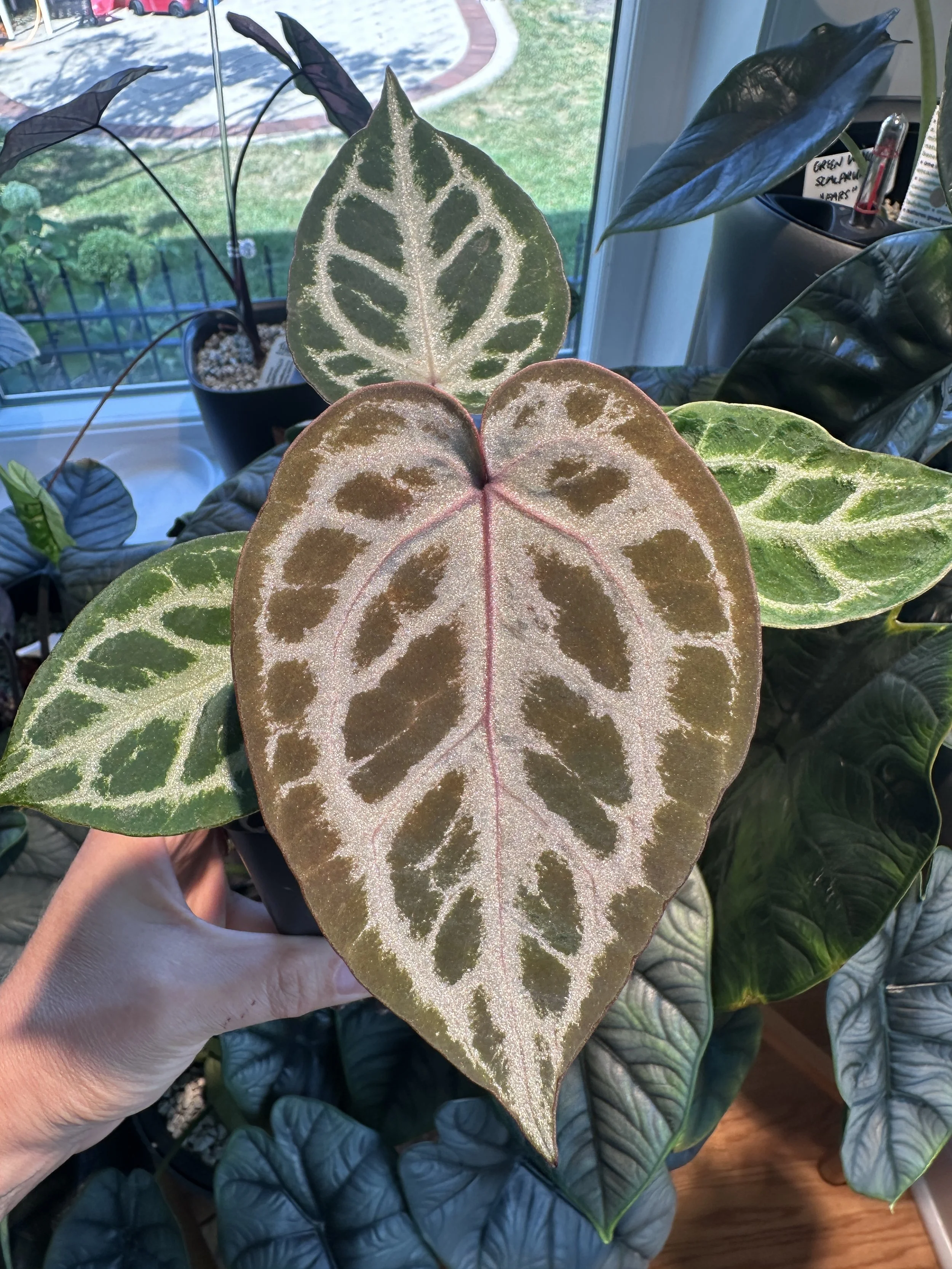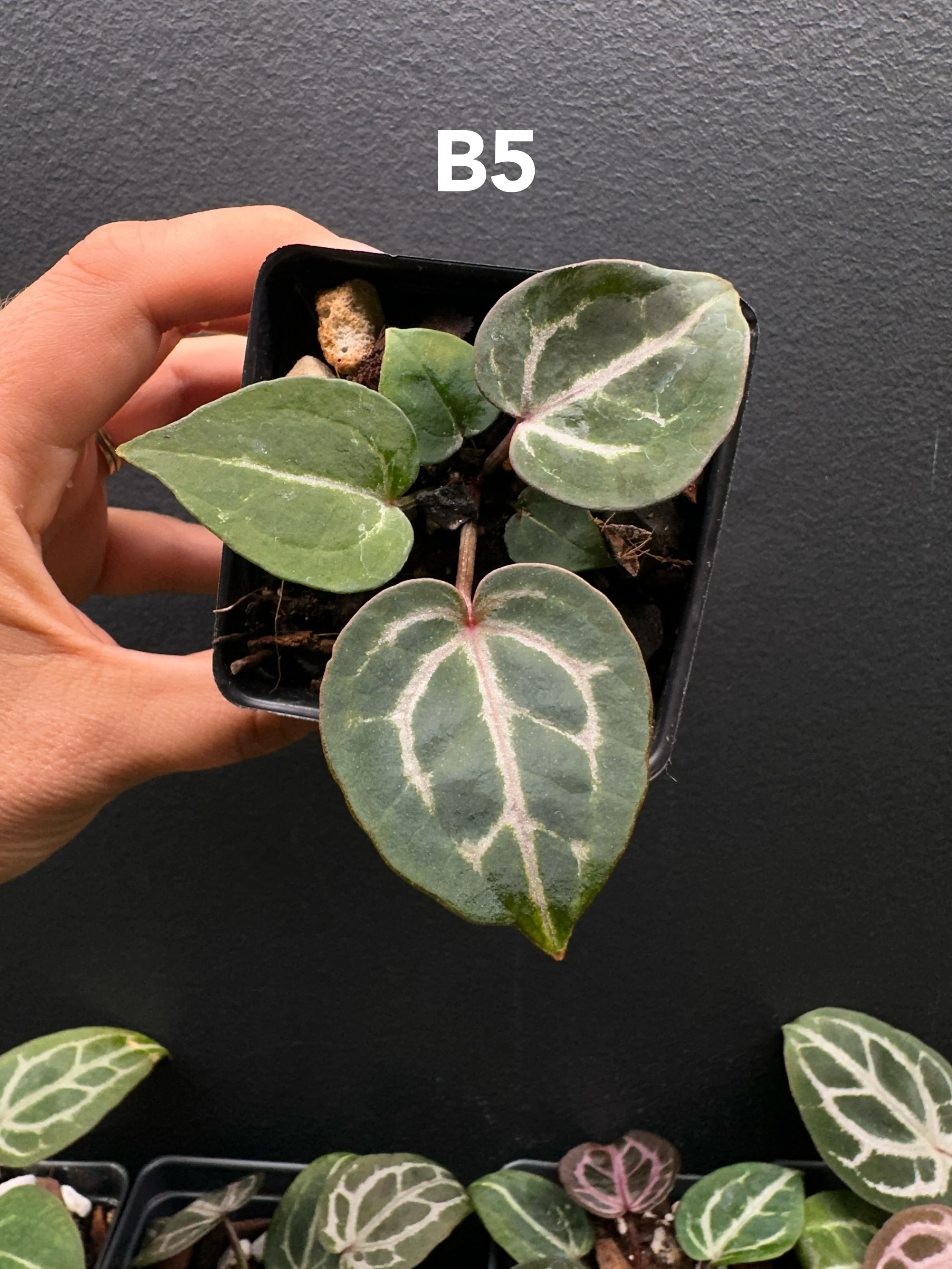 Anthurium Red Crystal Blush F3 generation plant (third breeding generation). You will get the exact plant shown. I price plants based the color of the emergent leaf, amount of silver, and leaf shape. Red and purple vivid emergents, high amounts of silver and round leaf shapes are most desirable. All leaves harden off to green.